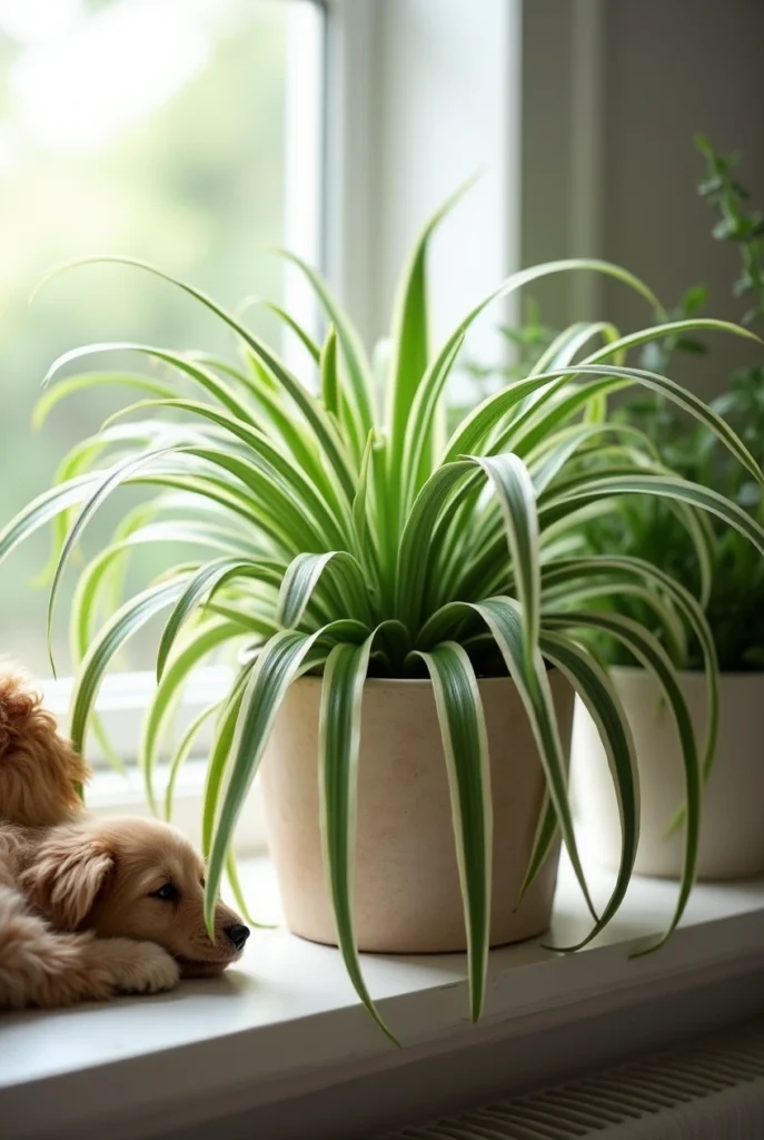 Spider Plant (Chlorophytum comosum) is one of the most popular indoor plants that is non-toxic to both cats and dogs. It’s easy to grow and thrives in most homes.
